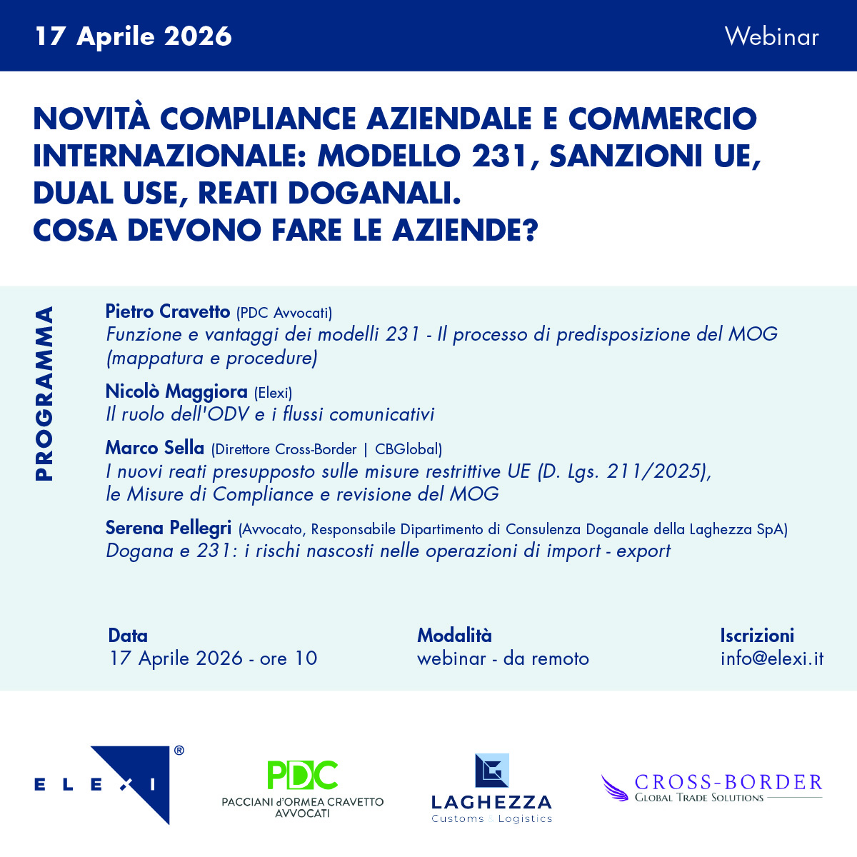 Webinar organizzato da Elexi insieme allo studio Pacciani d’Ormea Cravetto Avvocati, alla Laghezza SpA e a Cross Border Global Trade Solution, sulle recenti novità legate alla compliance aziendale e al commercio internazionale.